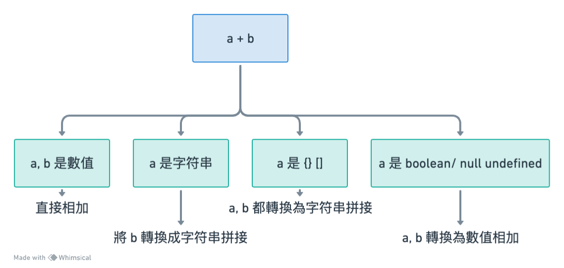 - 另外還有一種特殊情況 + 頭 的相加式,有些瀏覽器會將視為一個塊符號,所以不會參與相加,而是把+符號視為轉換符(Number)將後面的運算元轉換為數值。