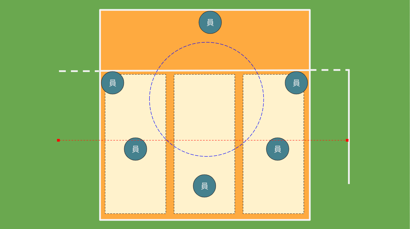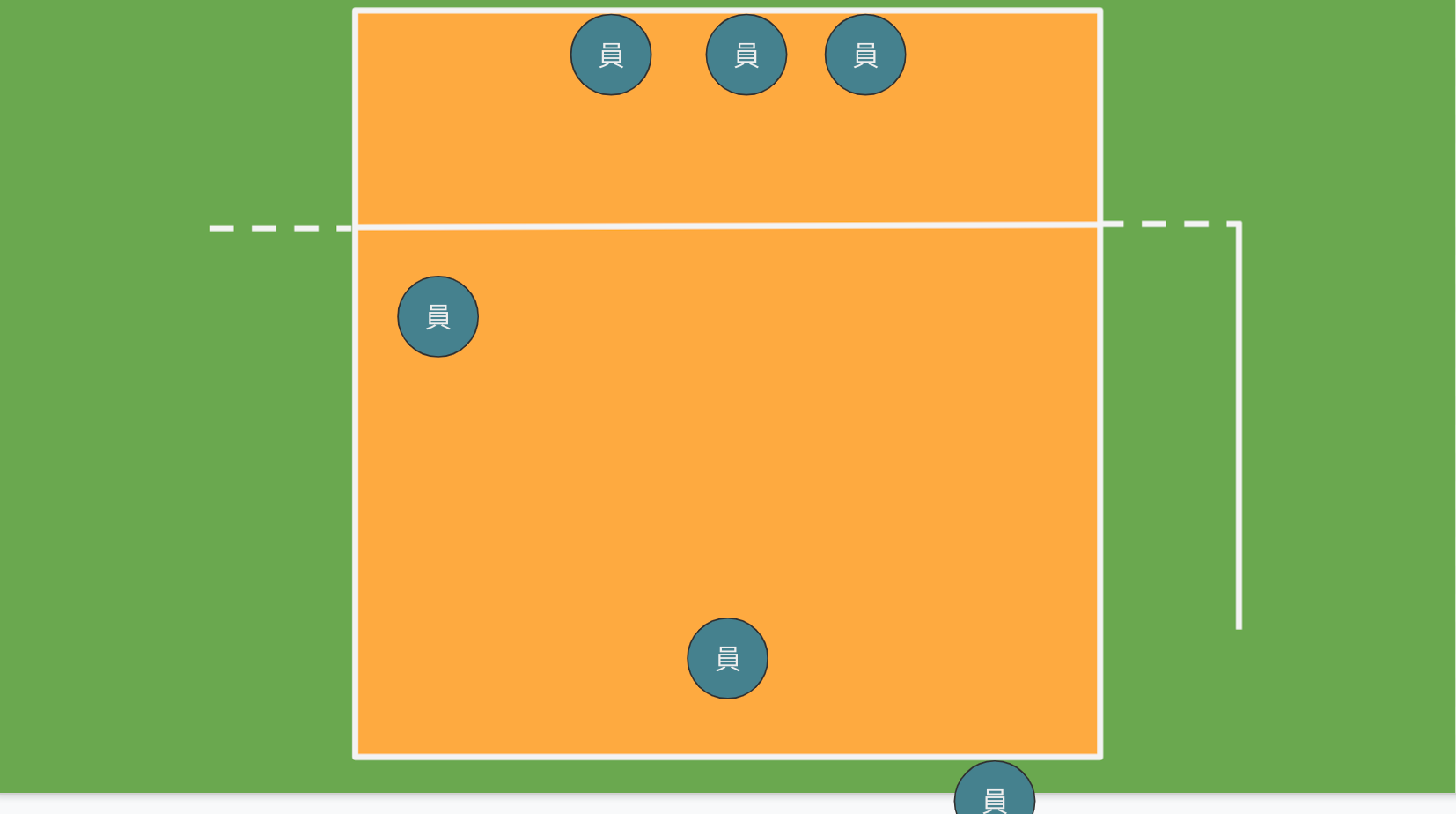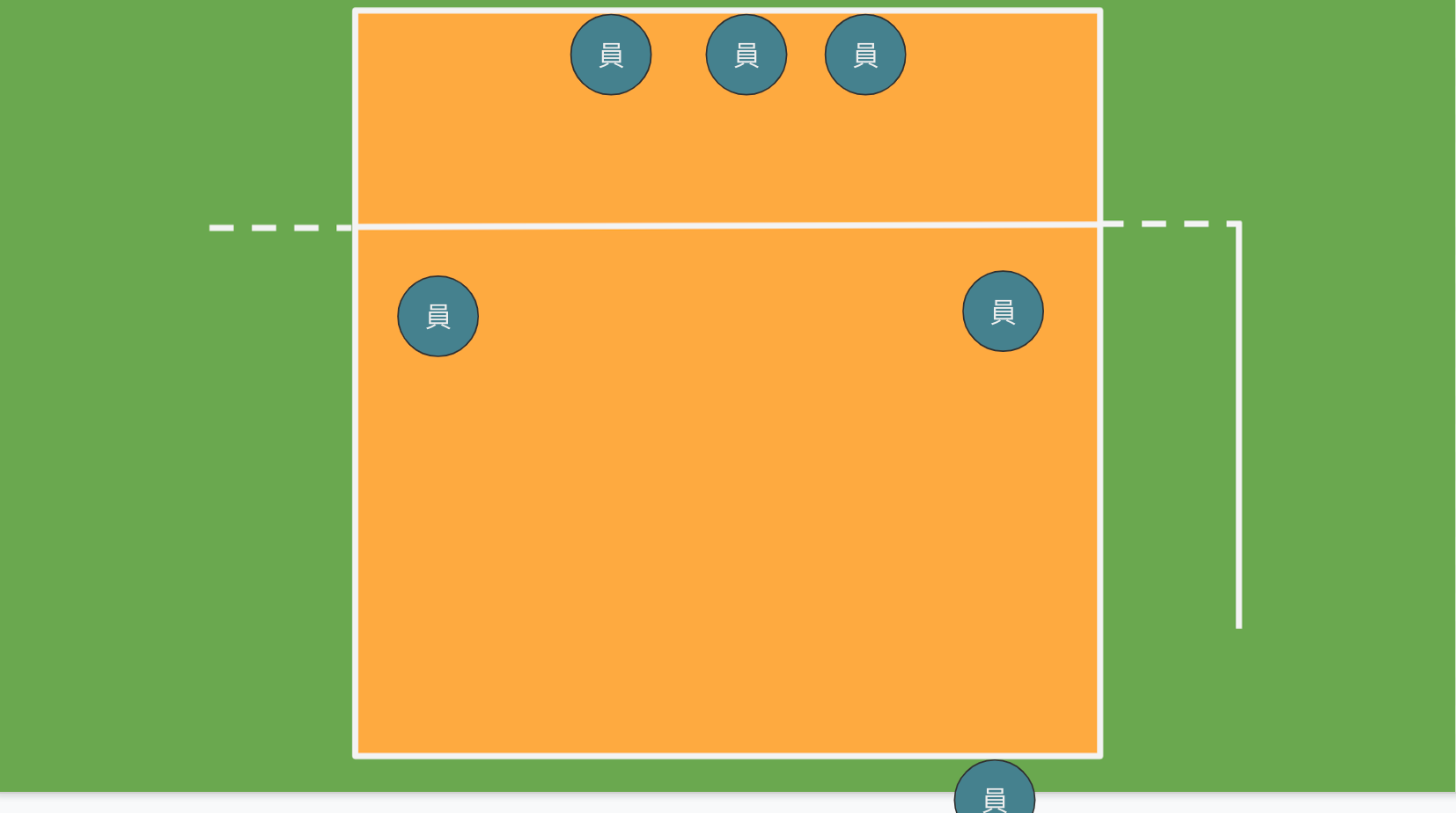 可以看看到前排的守備球員已在網前預備欄網,後方的球員已預備好進行接扣防守,發球的人員也會馬上到 1號位 前面進行防守,但會發氣 前方其實有好大的一個空缺,如果對方在第一時間直接把球打回來,便會增加防守的困難度,因此也可以變成下圖