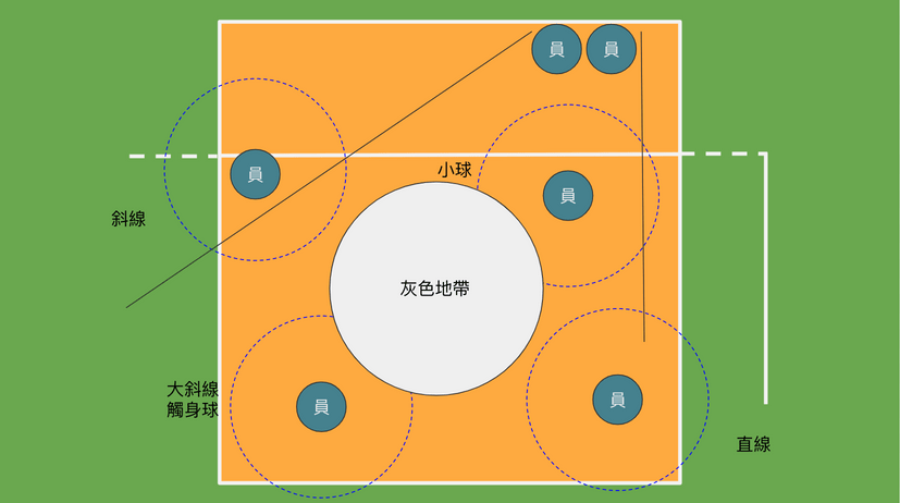 前排的防守球員會有兩個人主力去作欄網,另一個人會來接斜線,後排的三位球員格別負責小球、直線、大斜線、觸身球、中間的灰色地帶主要會是欄網者去負責。驅動像這樣子的防守隊形是要由欄網者決定,如果欄網沒有定位,剩下的防守者也會沒有辦法好好的預備防守。